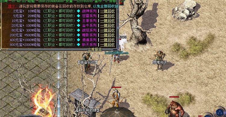【新手介绍】:非RMB玩家,去[散人激情打宝]打怪爆装备,可回收大量元宝!可以爆到王者、金牛、战狂、暗影、逍遥装备!新手装备去魔龙城打,练级带3倍经验勋章去疯狂练级
