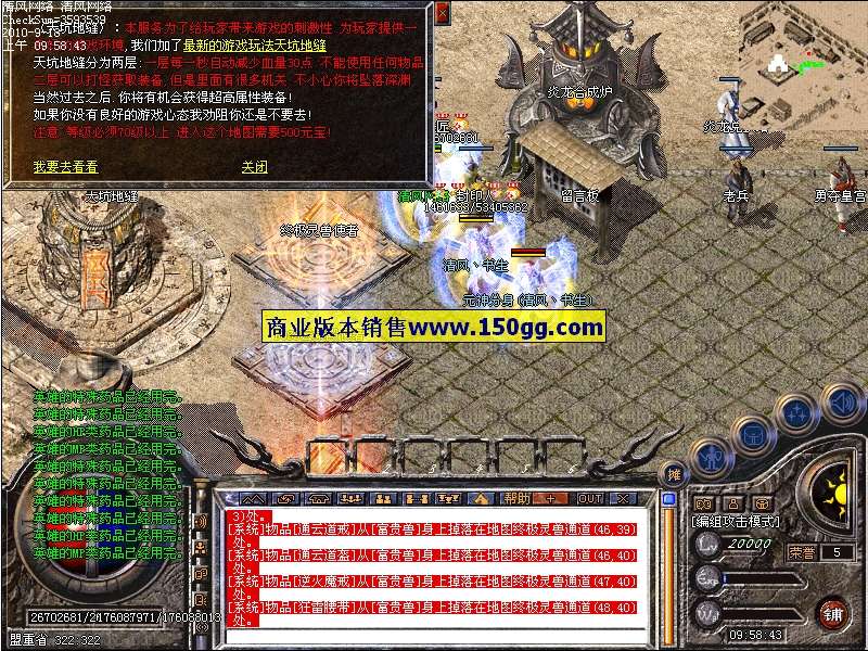 【特色地图】天坑地缝(刺激好玩), 神兵天下(爆武器的好地方),困兽之斗(激情PK抢怪打元宝的好地方)。