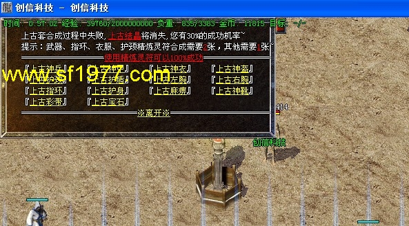 公告:高级装备攻略→上古合成(比奇城)→上古镶嵌(白日门)→2转装备(终极炼狱最后一层),每天中午12点30分举行年兽BOOS攻城,有几率爆出新技能