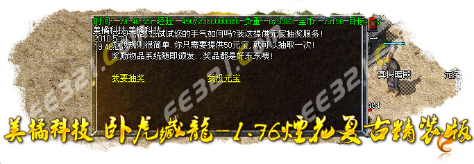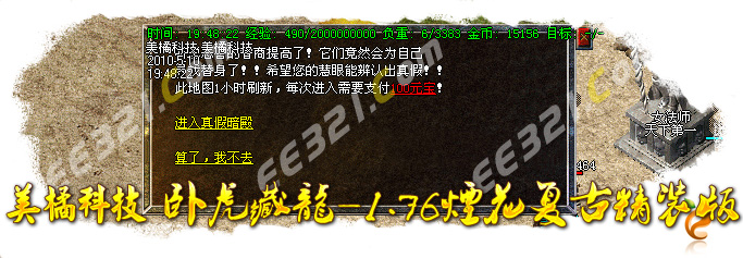 〖公告〗:服务器保证每位玩家的利益,服务器承诺不会为玩家刷任何装备和属性点。一切装备靠打,假如果你觉别人一个人打你4家人,就说GM帮他调属性你可以离开,人家PK用的是太阳包,攻击药水。你用上以后也会出来这种感觉
