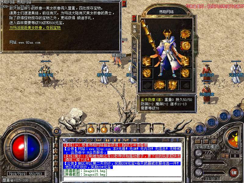 4.新区开区第二天攻沙,奖励20W元宝+倚天武器或衣服任选一件!老区天天攻沙,奖励20W元宝
