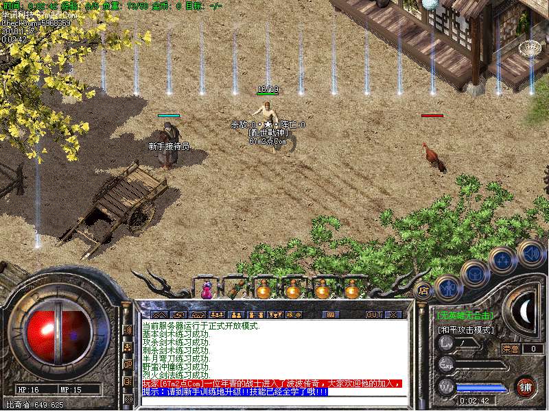 8.各位PK高手请注意新增的游戏热键: Alt+T 交易 | Alt+S 道士下毒模式(互换,绿毒,红毒) | Alt+I 打开包裹 | Alt+P 组队窗口 | Alt+C 人物窗口 | Alt+V 技能窗口!