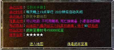 ⑨.群英争霸:每天晚上19点举行.获胜者获得5000元宝+武林至尊PK王称号