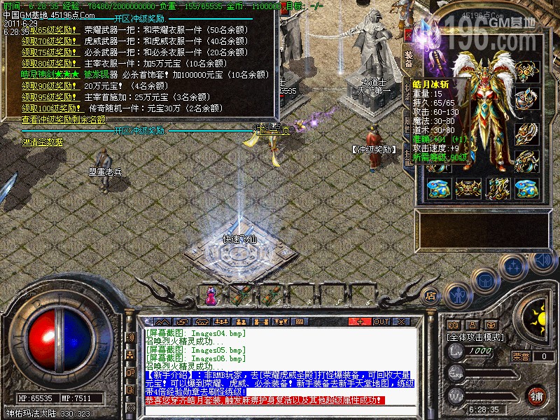 【新手介绍】:新手练级:新人战场出来后直接到新人泡点轻松到70级. 新手打宝:新手天堂地图.轻松获得武装自己的装备.还可以暴到宝箱卖元宝.