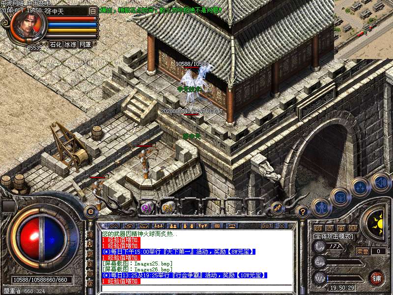 (*)每晚攻沙后,22:30--23:30,在[土武器店门口]附近每隔5分钟发放10000元宝、一千万经验卷