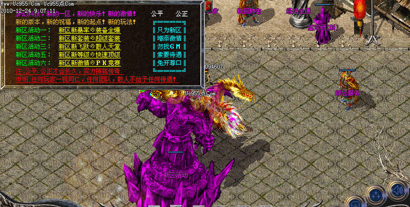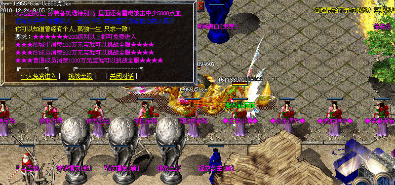 天下第一申请;每天零点自动清理,请玩家去NPC处申请,1.2倍攻击可别让别人抢走咯,还可以领奖哦,(1.2被攻击包括攻击/魔法/道术)(城主为1.3倍)