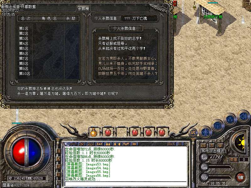 【独家排行系统】不管你有什么实力,只要你有实力。你的名字就能响遍全服。你PK厉害,游戏中有专门的玩家杀戮排名榜;你有钱,游戏中有专门的玩家杀财富排名榜;你装备好,游戏中有专门的装备评价排名榜;你会赌神,一样,别人也会知道你的鼎鼎大名,游戏中也有专门的赌王排名榜。如果你能上各类的排名前十,那么,你将更会获得专门的特殊称号。每个称号也都有玩家想要的属性加成。