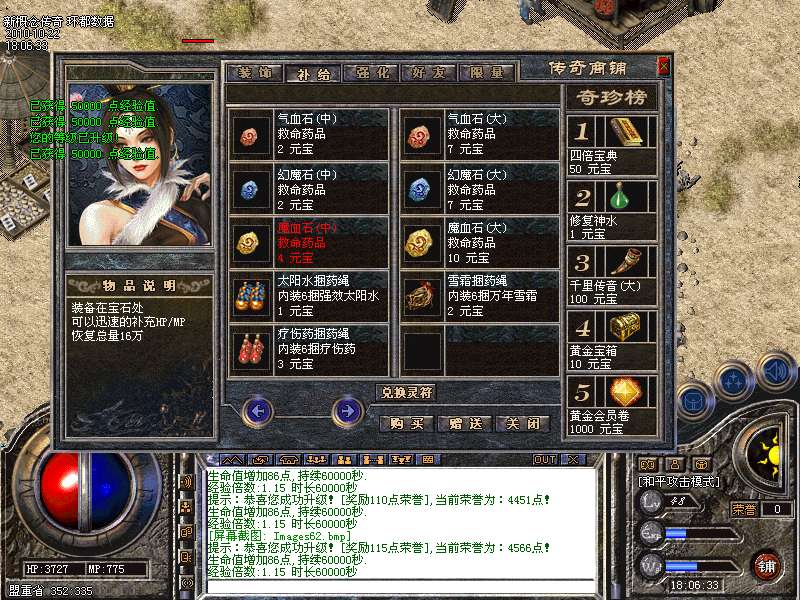 【元宝售价】:「短信1:100」「点卡1:150」「网银1:200」,在线充值请登陆本官方网站进行充值,充值成功后,到游戏[元宝充值NPC],领取元宝 [游戏本无价,购买自权衡。需求者千金不贵,无意者一分不取。