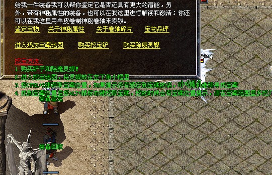玛法宝藏地图里可以挖出鉴定装备需要的各种卷轴!和高级装备!按CFRL+X建获取宝藏位置,如果提示没有感应到宝藏的话,可飞随机继续寻找宝藏!找到宝藏位置后按ALT+鼠标右键挖取宝藏,挖的时候会有宝藏位置提示,请在宝藏范围里多挖几次.