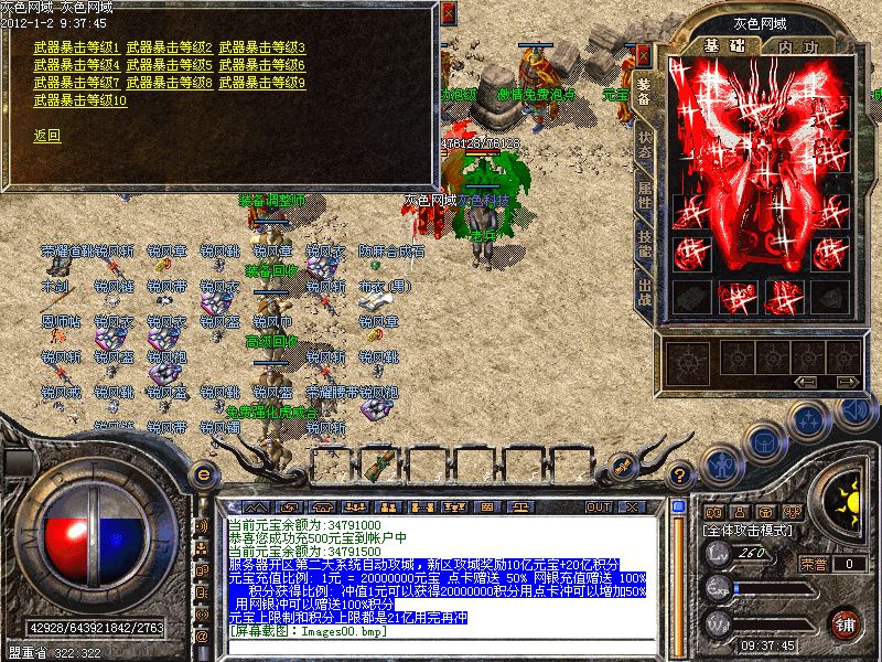 元宝充值比例: 1元 = 20000000元宝 点卡赠送 50% 网银充值赠送 100% 积分获得比例: 冲值1元可以获得20000000积分用点卡冲可以增加50%用网银冲可以赠送100%积分