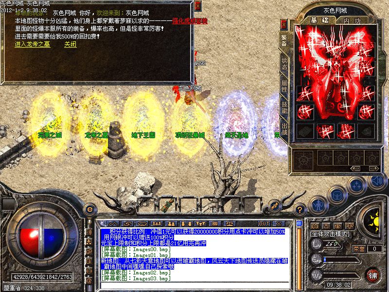 新增【顶级狂爆城】【地下王国】【龙帝之墓】【完美之城】【无暇之地】【处男悲泣之地】【处女泪雨之地】【天意之地】此新增地图绝对可爆全服所有装备装备,包括特殊戒指和物品,此新增地图全部分为两层,第二层的爆率可比第一层高的多哦