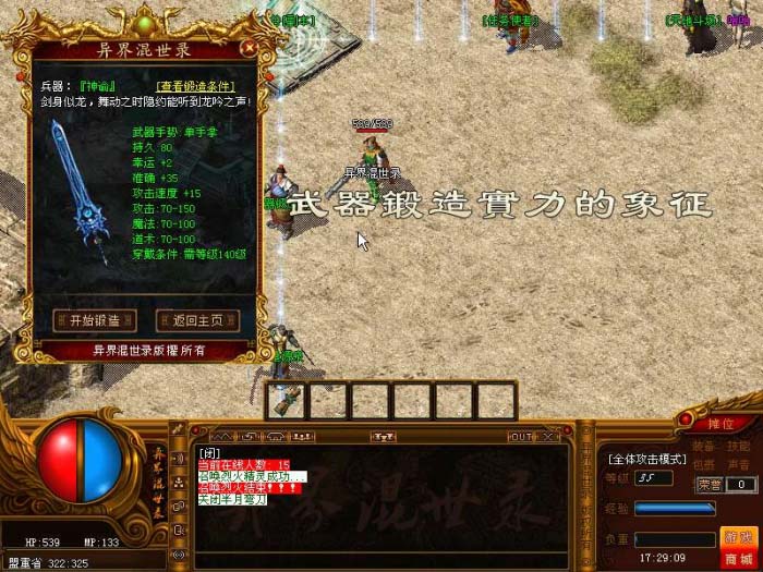 武器锻造:锻造武器不需一个元宝.根据每种武器的图纸,给予土城武器锻造师处打造不同的武器