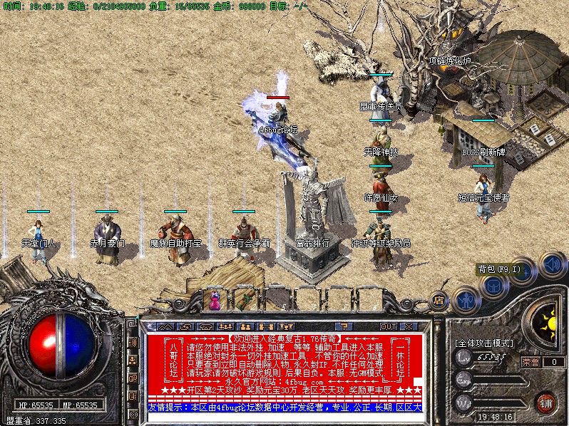⒙本服.每天下午15:30分—16:00分系统会弹出窗口提示[群英争霸战、激战30分钟]最后一个活在里面的玩家将可以获得奖励元宝38888个....