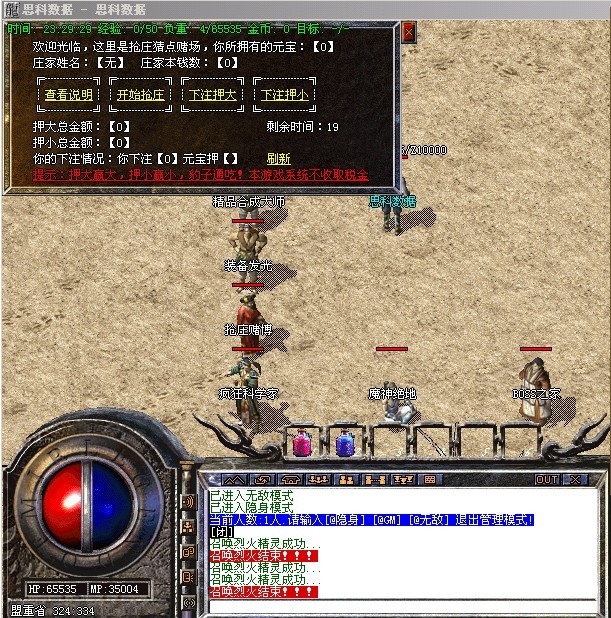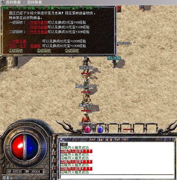 〖提示〗:本服务器为长期服,拒绝家族形式玩家,禁止外援,45级以下禁止攻城!为避免被删号,家族玩家请绕行,谢谢合作!晚9点到10点之间,藏宝阁沙巴克秘史可以传送进入皇宫!